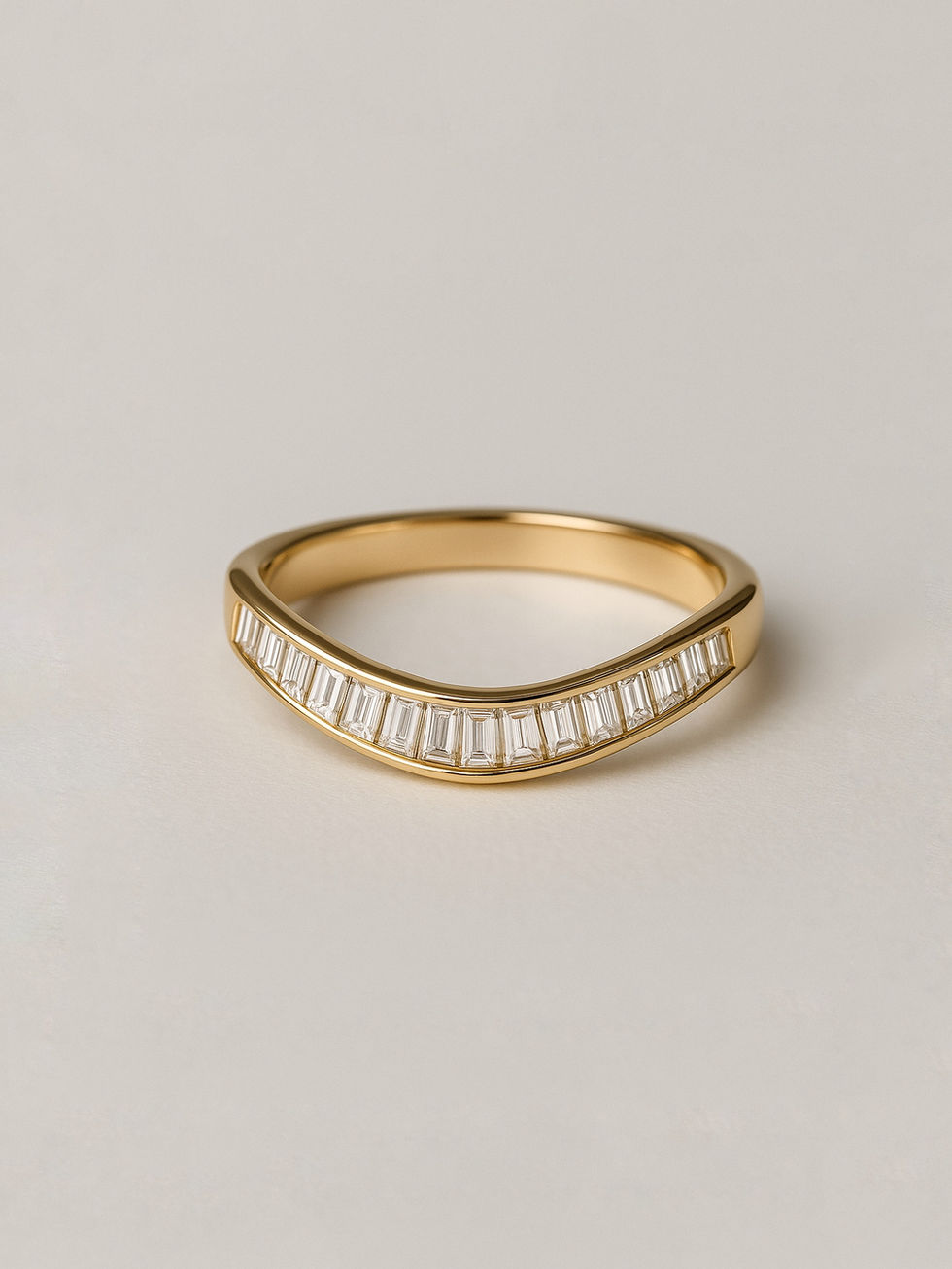 A curved channel band featuring straight and tapered baguette stones that will add elegance and sophistication to any ring stack.